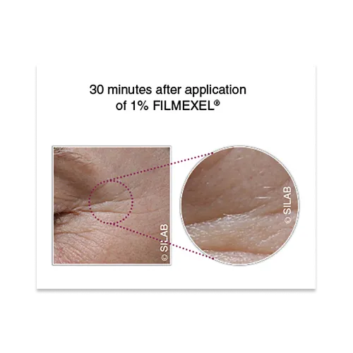 Adeplump® (arnica) activates adipocytes for plumpness; FILMEXE®’s patented “second-skin” micro-tension network firms and sculpts contours.