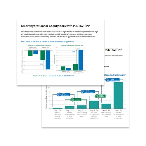 Multi–molecular-weight hyaluronic acid (high/low–MW HA) penetrates the epidermis and dermis for rapid hydration, while Pentavitin® locks in moisture for up to 72 hours, keeping skin plump and hydrated all day.